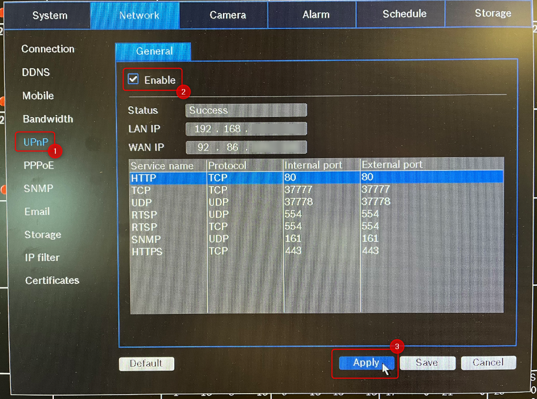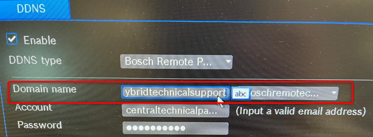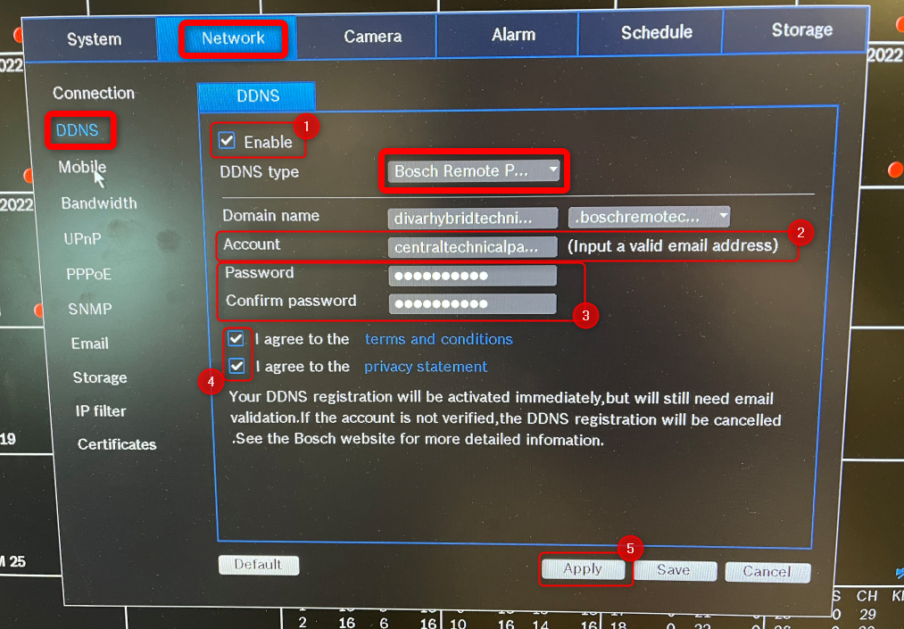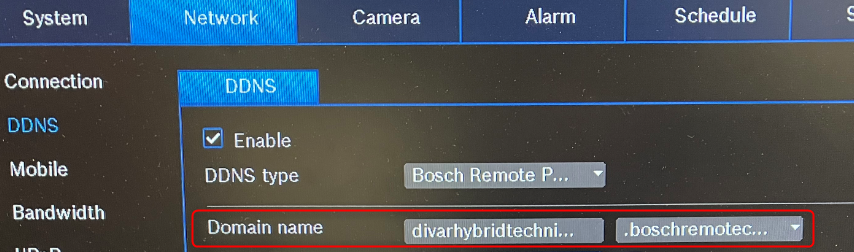 - Go to Settings > Network > DDNS > select “<strong data-id="48"Bosch Remote Portal” next to the DDNS type