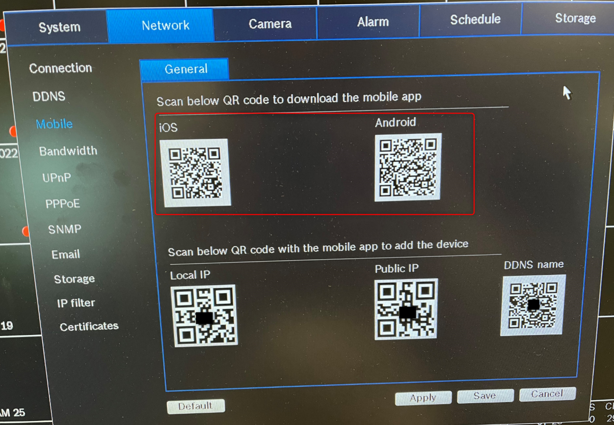 - Go to Network > Mobile > General and scan the QR code to download the Mobile Viewer app if you haven't already installed it on your phone/tablet