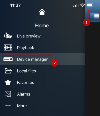 - Once the DIVAR Mobile Viewer app is installed on your mobile device, open the app > click on the menu on the left > select device management > then click + to add a new device