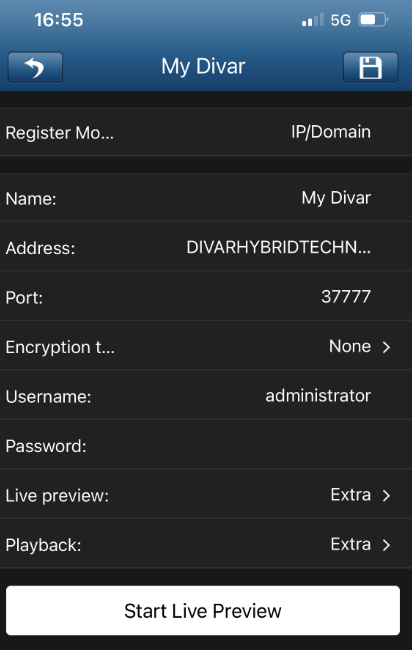 - Enter the username and password and click Start Live Preview